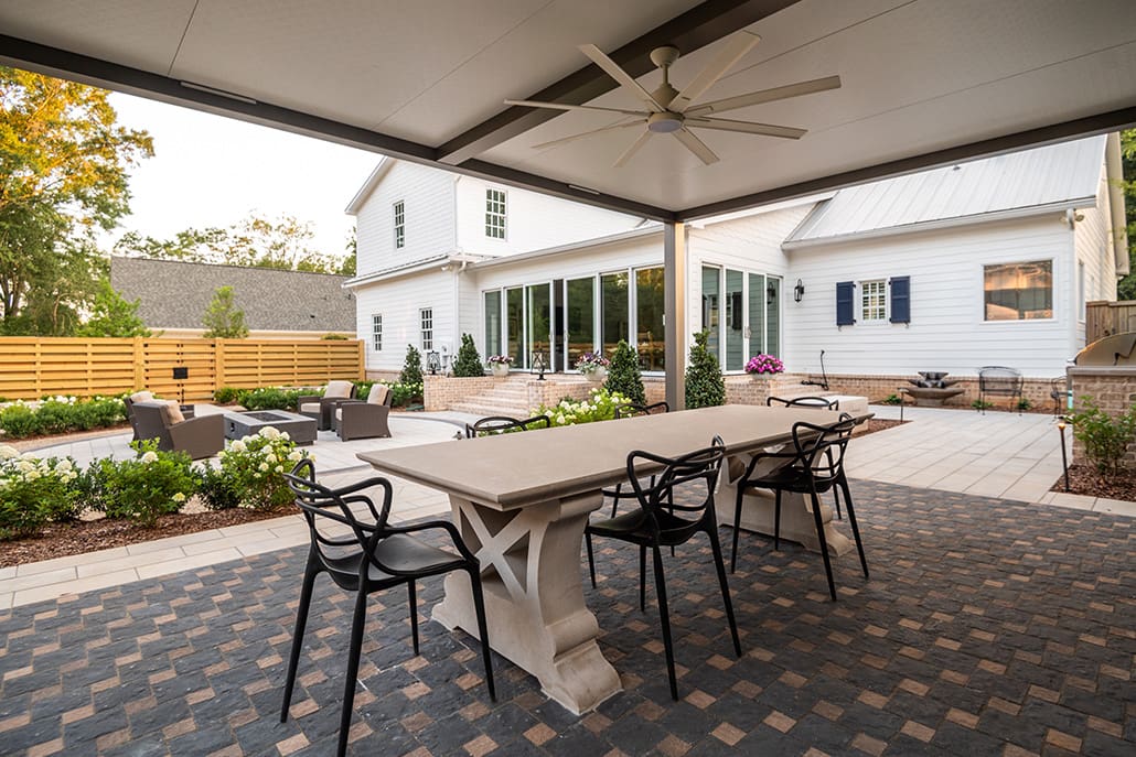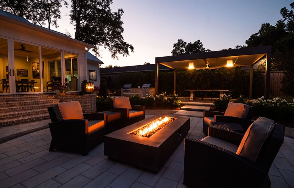 Anchoring the space is a custom fire table, surrounded by comfortable seating that encourages lingering long after the sun sets. Paired with a covered dining area, this setup is ideal for hosting everything from intimate dinners to big family gatherings – rain or shine, summer or fall.