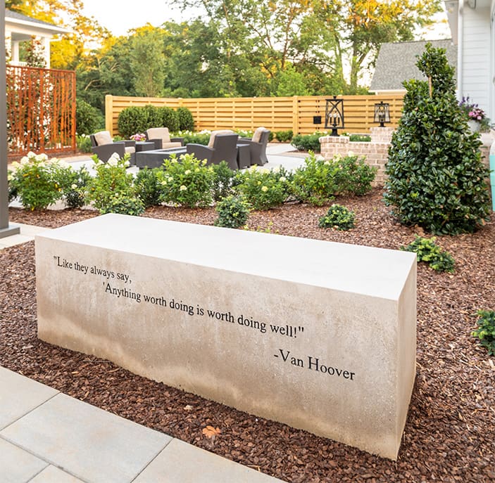 Throughout the landscape, natural stone pavers are engraved with hand-selected quotes that carry deep meaning for the family. These small but powerful details add a layer of personality and emotion to the space, turning a beautiful backyard into something truly one-of-a-kind.